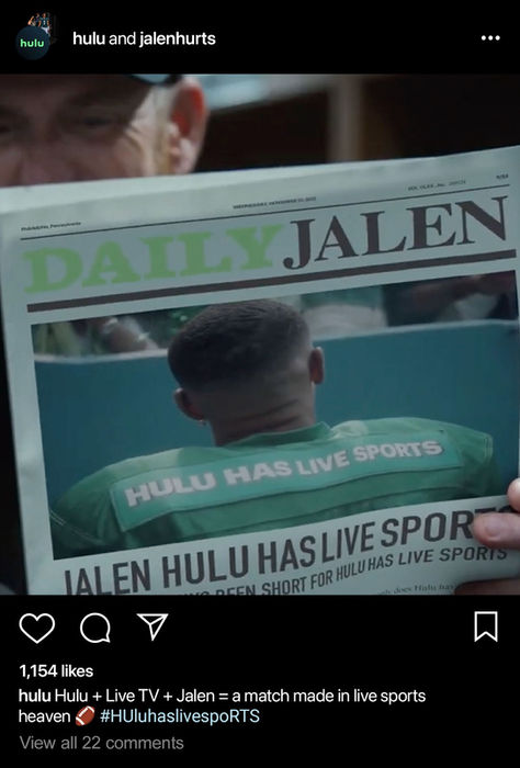 Some fun social copy I wrote for Hulu's fall campaign starring Eagles' QB Jalen Hurts.